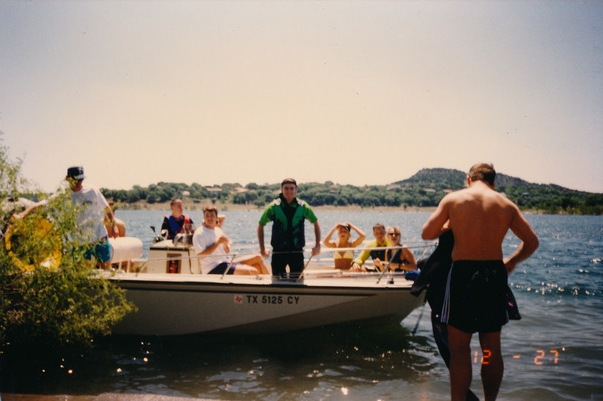 A group of people are on a white boat labeled TX 5125 CY as a man wearing black trunks stands facing away from the camera. |