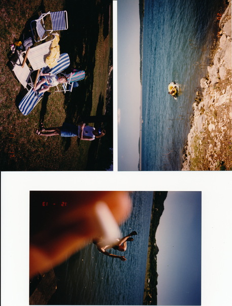 three photos of people enjoying the outdoors near the water |