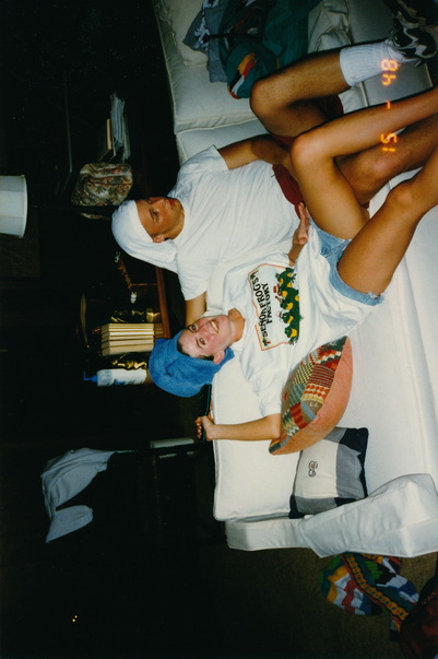 A woman with blue towel on her head sits on a white couch with a man wearing a white towel on his head. |