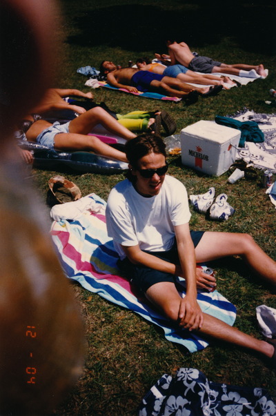 A group of people lie in the grass on brightly colored towels on a sunny day. |