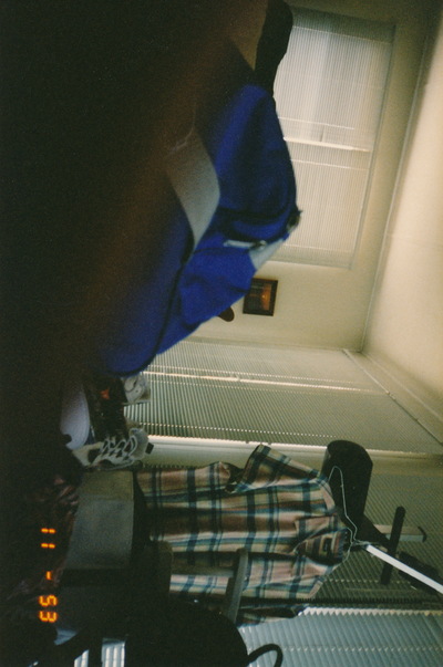 blue and gray backpack on the floor and a shirt hanging in the room |