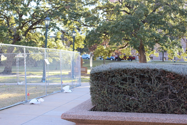 A large bush in a stone receptable near a sidewalk.