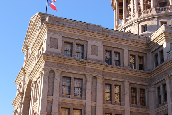 The majestic and tall building with two flags on the roof is seen on a beautiful, clear day. |