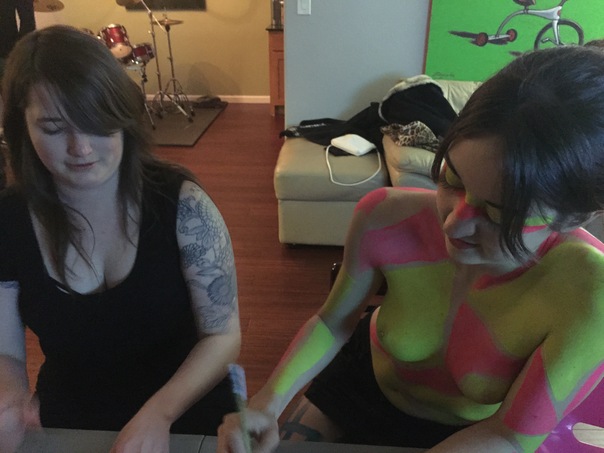 I invited a ton of people over and Claire being an artist and all helped paint Tara's body. My friend Jihan also came over and painted herself up too.