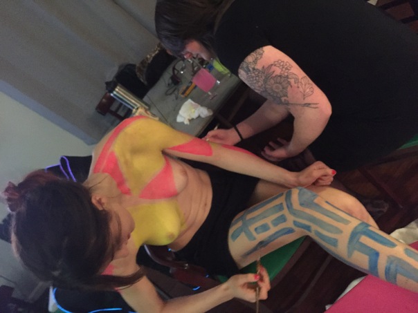 I invited a ton of people over and Claire being an artist and all helped paint Tara's body. My friend Jihan also came over and painted herself up too.