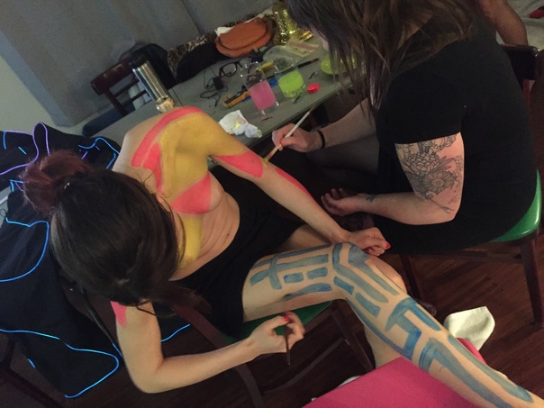 I invited a ton of people over and Claire being an artist and all helped paint Tara's body. My friend Jihan also came over and painted herself up too.