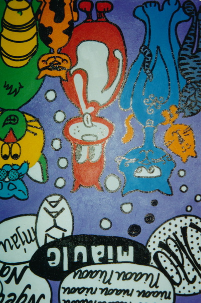 This is an abstract painting of some cats upside down.