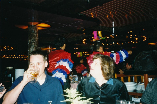 A young man in a blue shirt drinks from a cyrstal glass while a brown haired woman in a green shirt looks on.