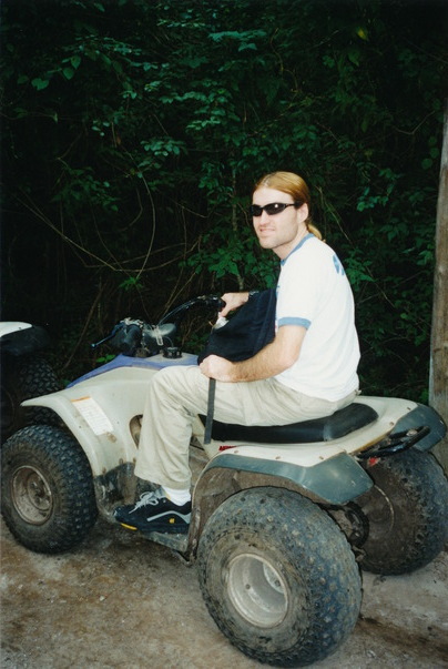 A blond haired man wearing man wearing sunglasses is sitting on a four-wheeler.