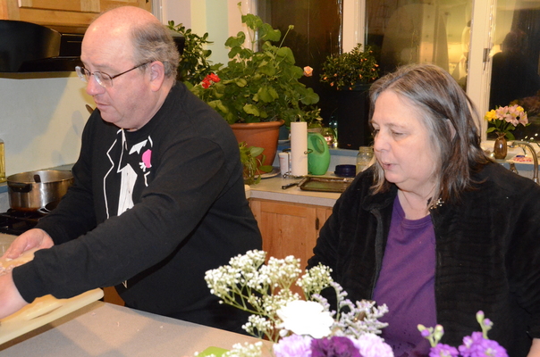 An old man is preparing for food and an old woman is watching it