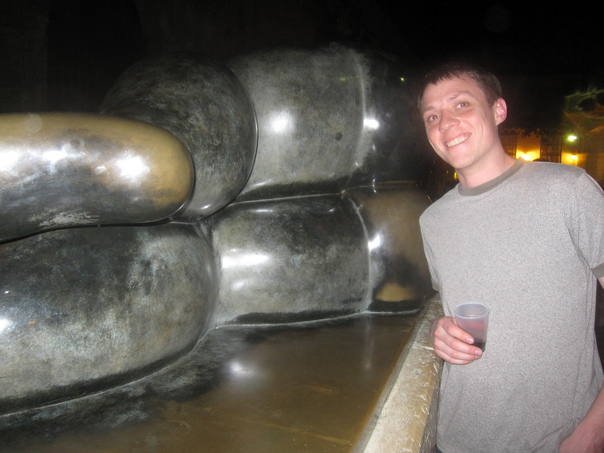 A smiling young man in a grey shirt standing near the rear of a stature of a large reclining human figure.