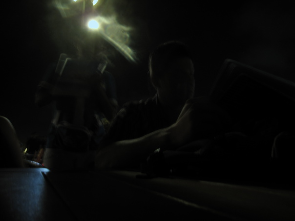 A very unclear picture that is black with a light shining in the background.
