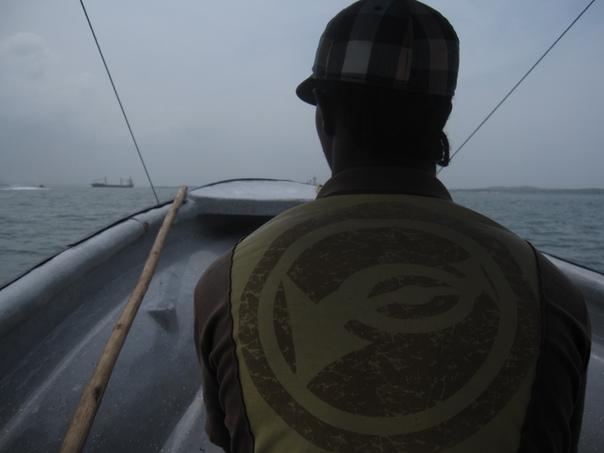 Someone wearing a hat and a graphic shirt is at the very front of a small boat on the ocean.