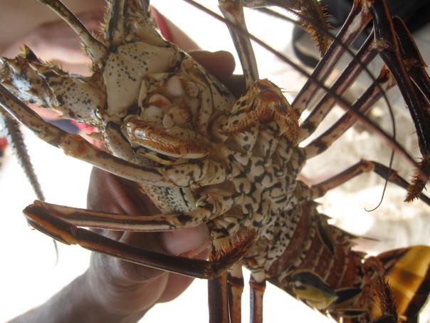 The underside of a lobster is displayed; the lobster has a yellow tail, a red body, and the underneath is white with black designs.
