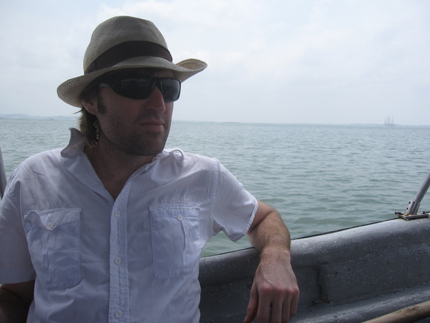 Man on a boat in open water wearing a fedora and sunglasses while looking relaxed.