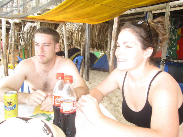 A man and woman having a meal and drinking Coke, in a tropical location with sand on the ground.