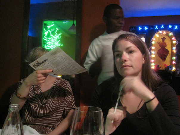A woman appears bored while sitting in a busy and fun-looking restaurant while her companion blocks her face from view with a menu and a man leans on the wall behind them.