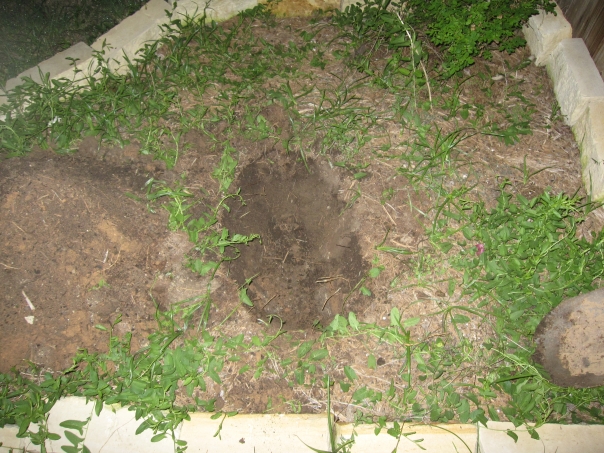 This hole was dug in the ground in the middle of a thick pocket of weeds.