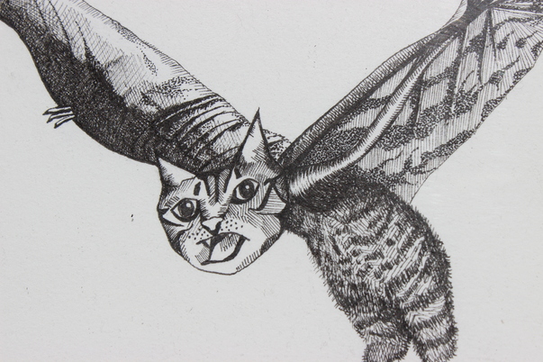 A creepy dark cat drawing with large demonic wings. |