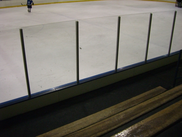 An ice hockey rink from the perspective of a spectator, the protective glass can be seen, some of the stands, and a lone player on the ice.