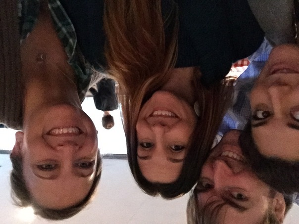 This is an upside down photo of people smiling at a camera.