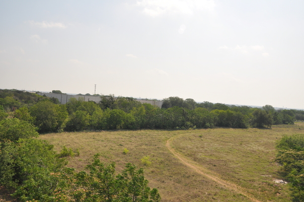 A dirt path going across a large flat area with green trees surrounding the open field.