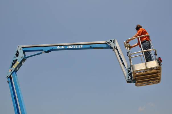 he is standing on the top. he is doing some work at the top.