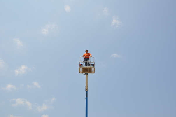 a person standing on a crane with the background of sky.