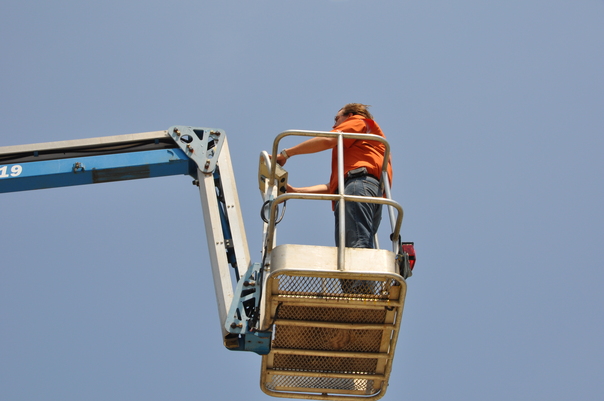 a man is wearing orange t-shirt and blue jeans standing on the crane.