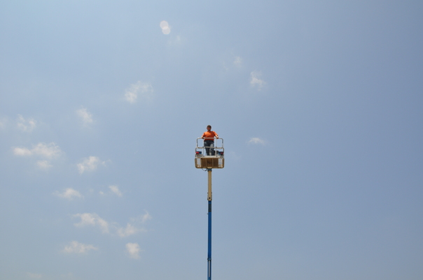 A portly gentleman casually stands in the bucket of a fully extended cherry picker.