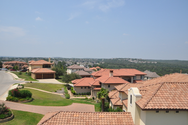 Aerial view of a urban street with houses and a view of the rooftops.