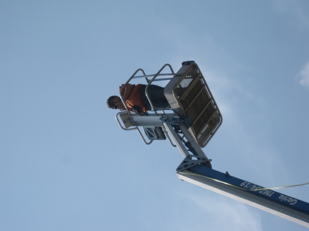A person, perhaps male standing in a lifting device, the sky is blue with a hint of cloud.