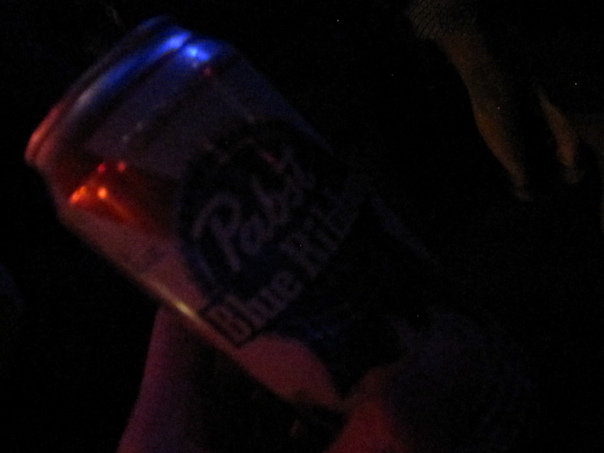 A close-up of a tin of Pabst Blue Ribbon beer in a dark environment.