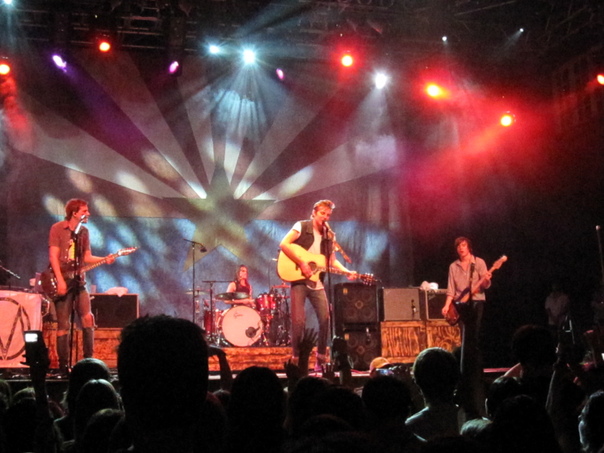 The band members are rocking the music concert while the spotligh shines on them.