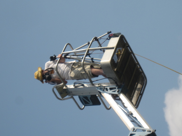 A person standing on a crane holding the tripod with one hand and taking photograph with his other hand.