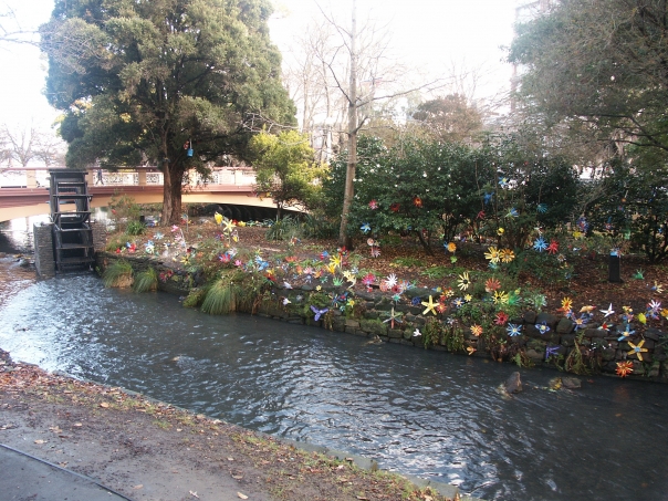River or stream of water surrounded by dirt with the further side with decorated flowers and star fishes.