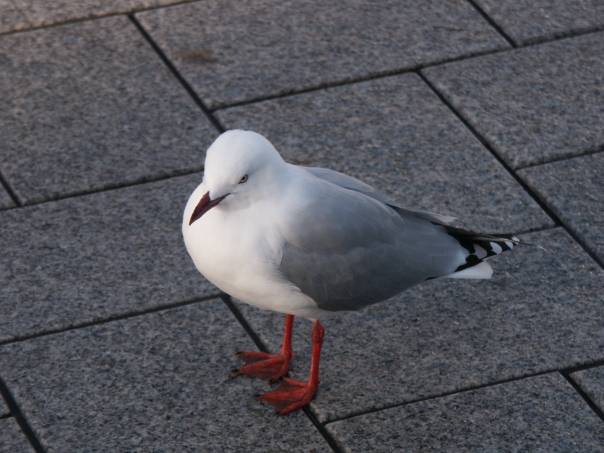 White and gray seagull sitting on gray marble like walkway.