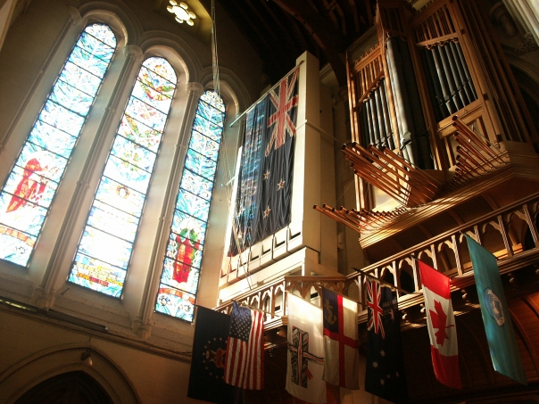 Flags of different nations are proudly displayed within the church. Come join us on Sunday Morning, no one will be turned away from this house |