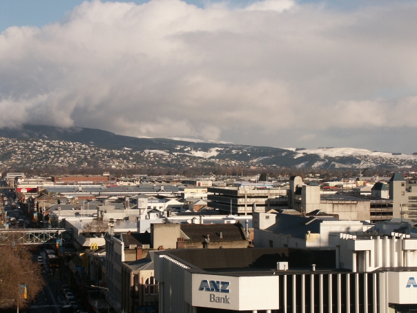 Just past the building that belongs to ANZ Bank, there's several other business and beyond them lies a mountain with snow at the top. |