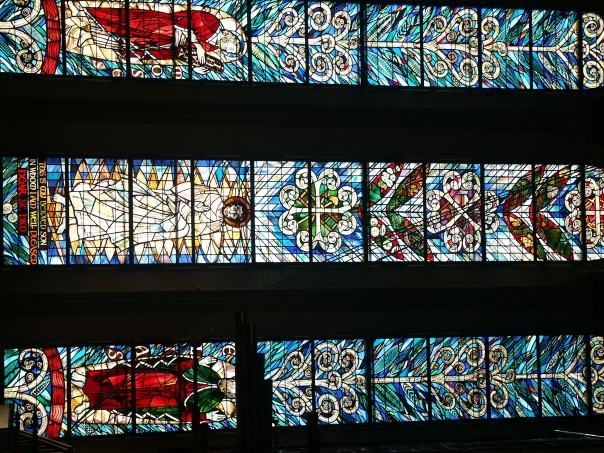 Stained glass panels lit up in the back of a church.