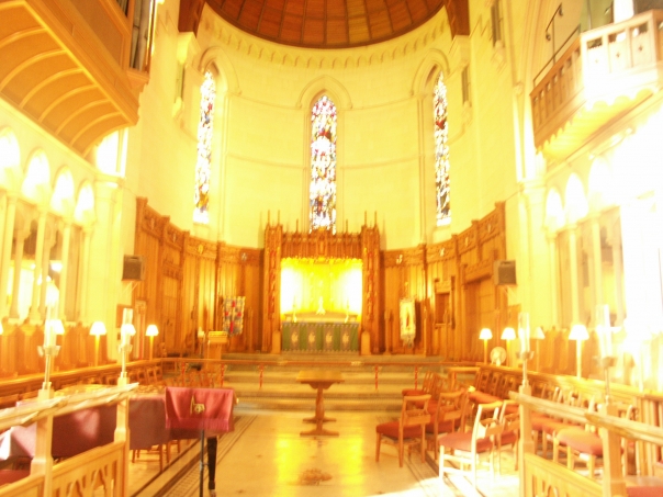 beautiful church with chairs and a altar in the middle