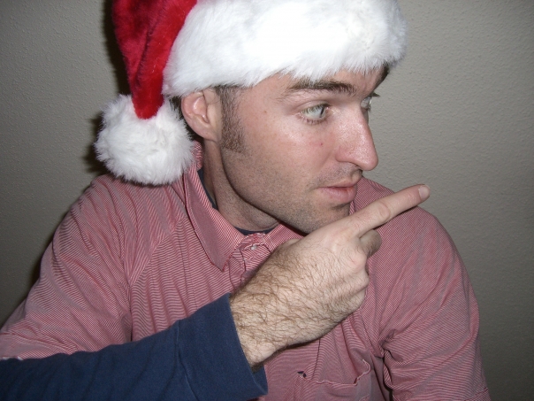 A man wearing a Christmas hat looks in the direction of a pointed hand.