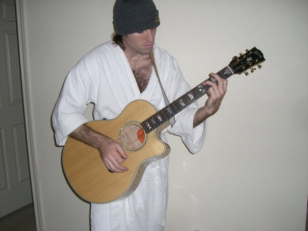 A man in a white bathrobe, wearing a black stocking hat and playing the guitar.