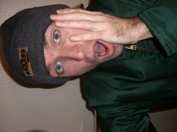 A man with a green jacket and gray hat is looking into the camera with his mouth wide open and his hand on his face.