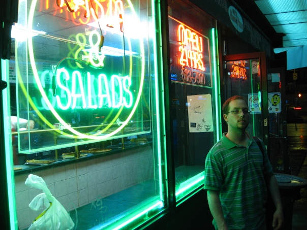 A man waits for his friend to show up with his wallet that he lost at the bar for a late night snack