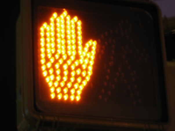A pedestrian caution sign shaped like a raised hand and made of amber lights glows in the dark.