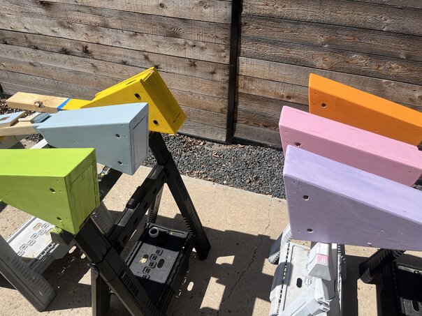 Since I'd spent a few weeks in January cutting down about a half an acre of scrub trees on her property for the purpose of highlighting the "real" trees, I thought it would be cool to build a set of these birdhouses.