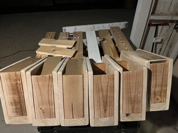 Since I'd spent a few weeks in January cutting down about a half an acre of scrub trees on her property for the purpose of highlighting the "real" trees, I thought it would be cool to build a set of these birdhouses.