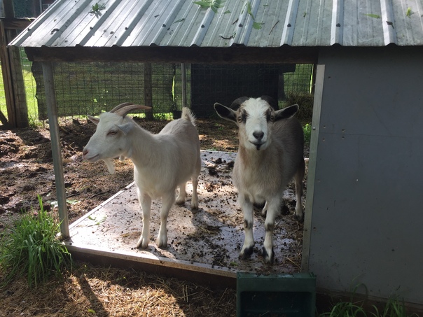 two white animals standing on a porch