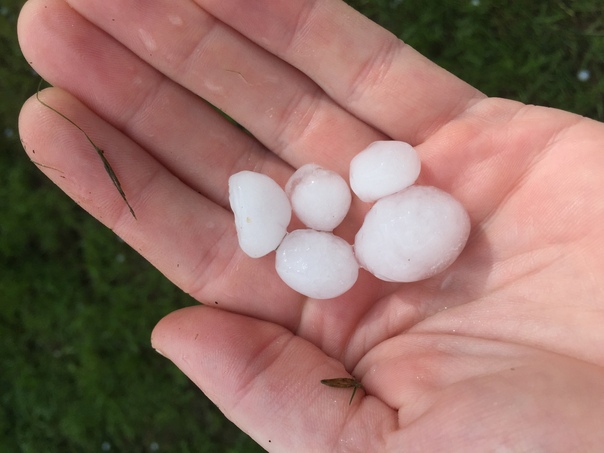 I see a hand holding five balls of hail that fell from the sky.